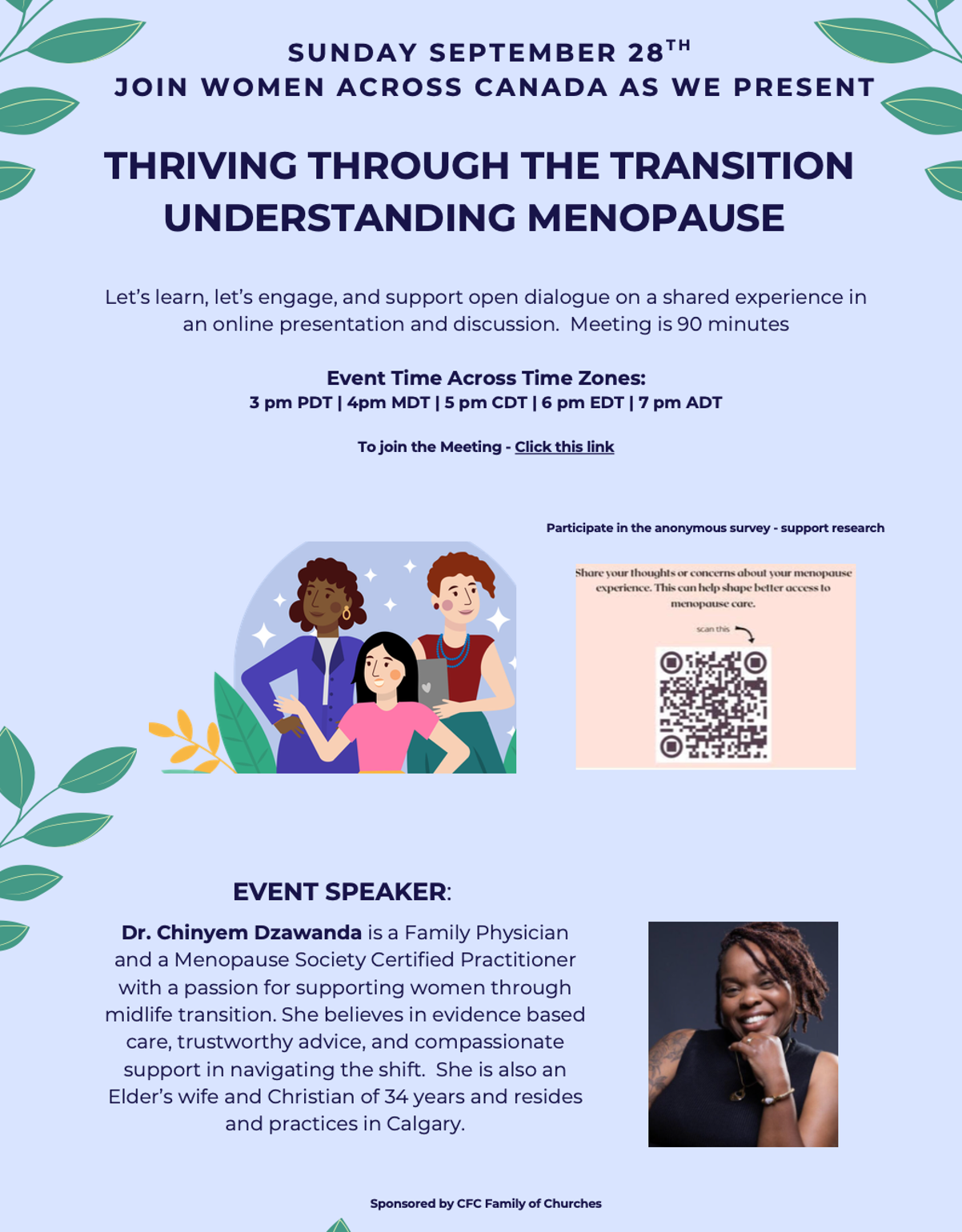 Topic: Let’s learn, let’s engage, and support open dialogue on a shared experience in an online presentation and discussion. Our presenter is Dr. Chinyem Dzawanda. She is a disciple in the Calgary Church who is a family physician and a menopause society certified practitioner.